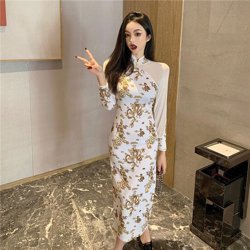 イブニングドレスロングスカート女性の秋と冬の宴会の気質レトロな中国風のセクシーなメッシュステッチはチャイナドレスを改善しました micat17262969327