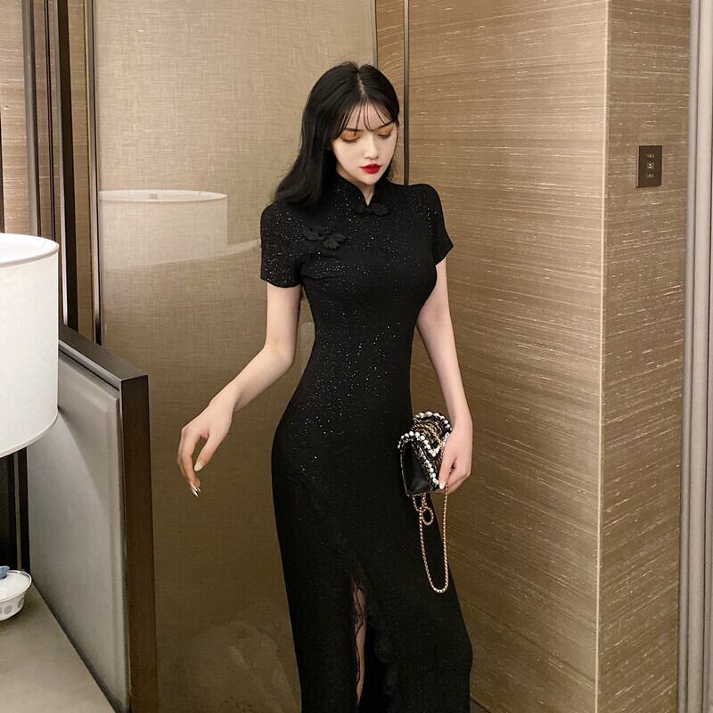 チャイナドレスのチャイナスタイル改良版チャイナドレスヤングデイリーウェアシャイニーダークミドル丈ドレス micat91230235783
