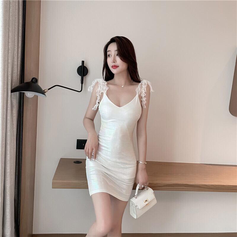 ナイトクラブの女性の夜の作業服光沢のある小さなドレスショートセクシーなローカットVネックサスペンダードレス micat5050980502