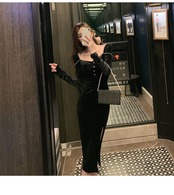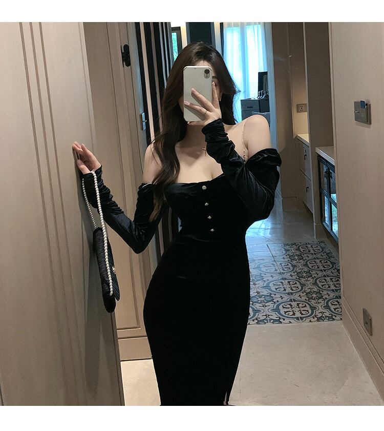 黒のイブニングドレス女性の秋と冬のハイエンド気質セクシーなオフショルダーゴールドベルベットミドルレングス長袖サスペンダードレス micat40317070654