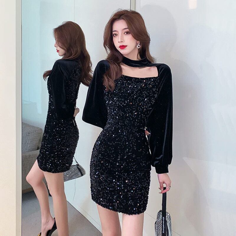 年次総会小さなドレスショートディナーパーティー気質スパークリングスパンコールセクシーな中空ゴールドベルベットスリムフィットヒップドレス micat10735223595