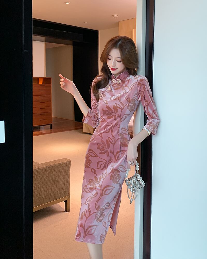 年次総会イブニングドレス女性の宴会の気質レトロな中国風ゴールドベルベット5点袖ミドル丈チャイナドレス micat28000139953