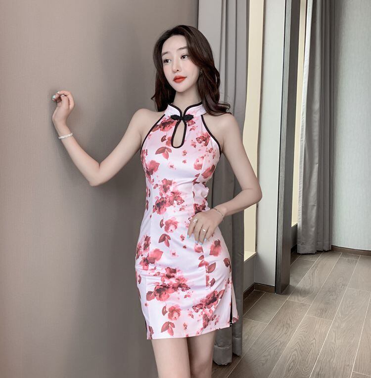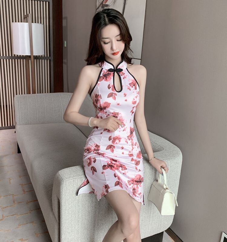 チャイナドレスの女性の夏の夜の作業服の改良版中国風のプリントセクシーな背中の開いたスプリットショートヒップドレス micat7083956962