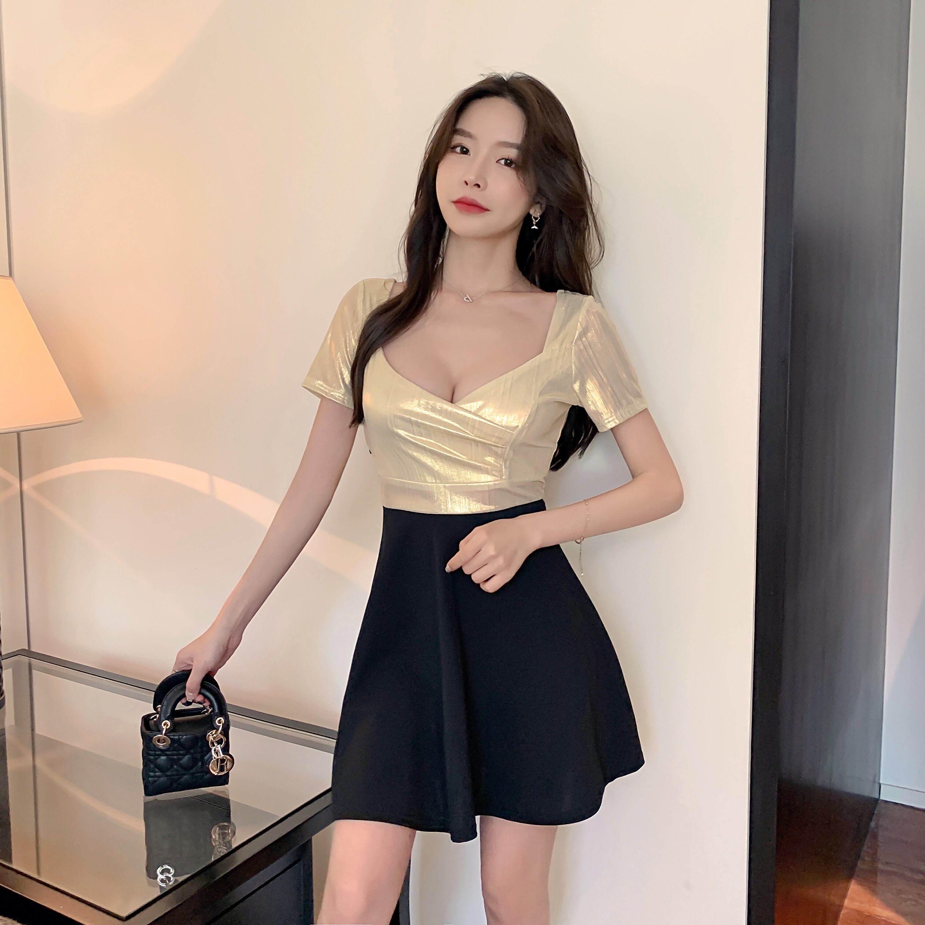 ナイトクラブの女性の作業服セクシーな作業服光沢のあるローカットディープVネックスリム半袖ドレス micat12262273931