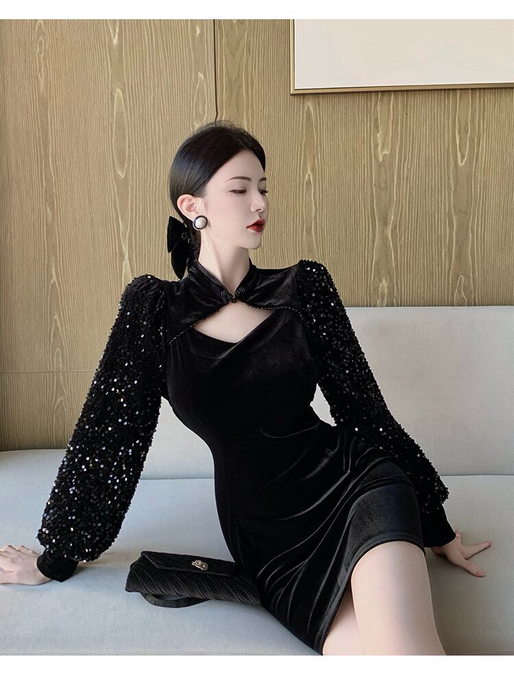 改良されたチャイナドレスイブニングドレスショートウィメンズイヤーズイブヤングバンケットテンペラメントスパークリングスパンコールゴールドベルベットドレス micat56260269759