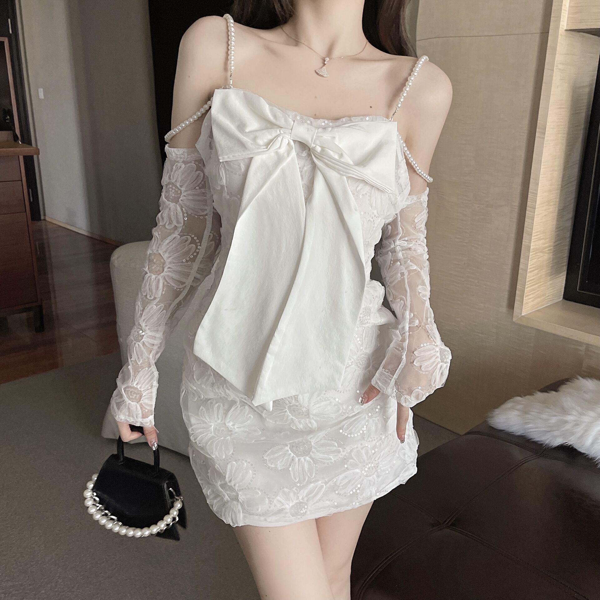 イヤーズイブスモールドレスショートレディースフレンチスーパーフェアリーメッシュスウィートボウセクシーロングスリーブスリングドレス micat9343885061