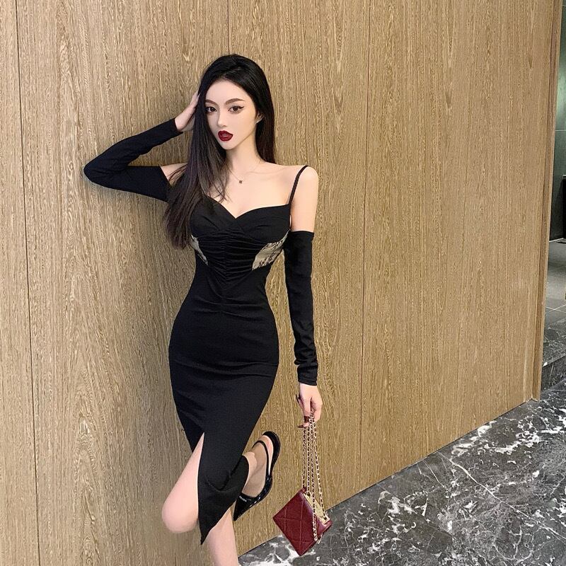 黒のイブニングドレスナイトショップ女性の宴会気質セクシーなVネックレースステッチミドル丈サスペンダードレス micat58127539980