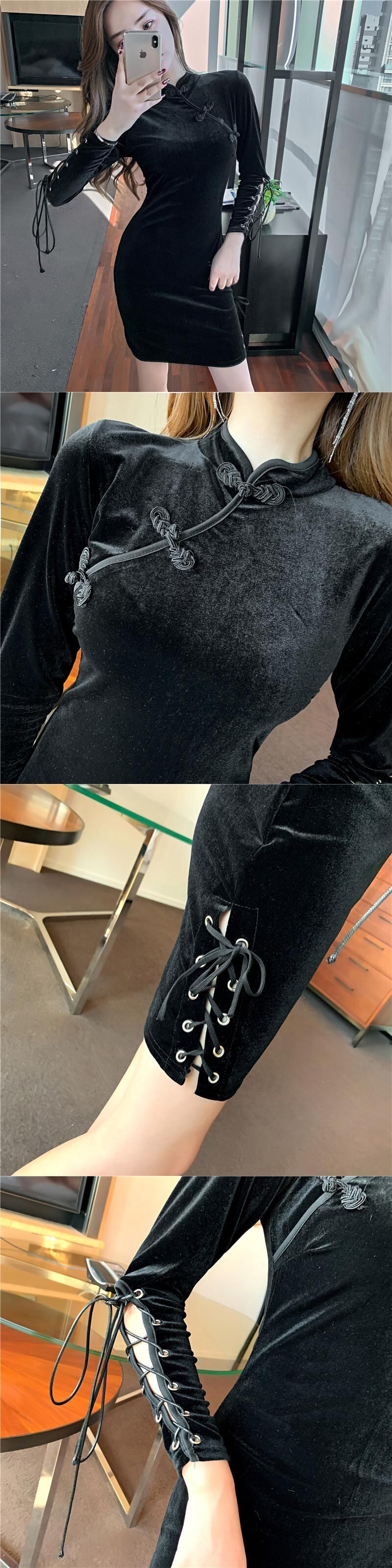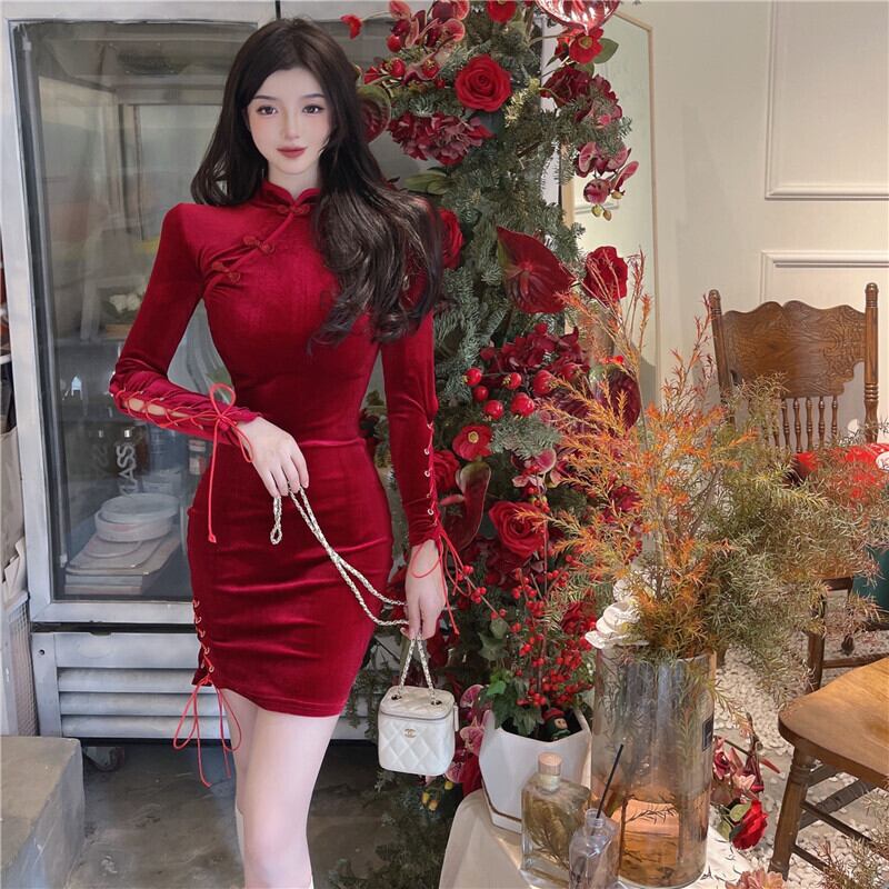 クリスマスの女性の赤い新年の若いアンカーコスチュームチャイナスタイルのゴールドベルベットはチャイナドレスを改良しました micat21030001085