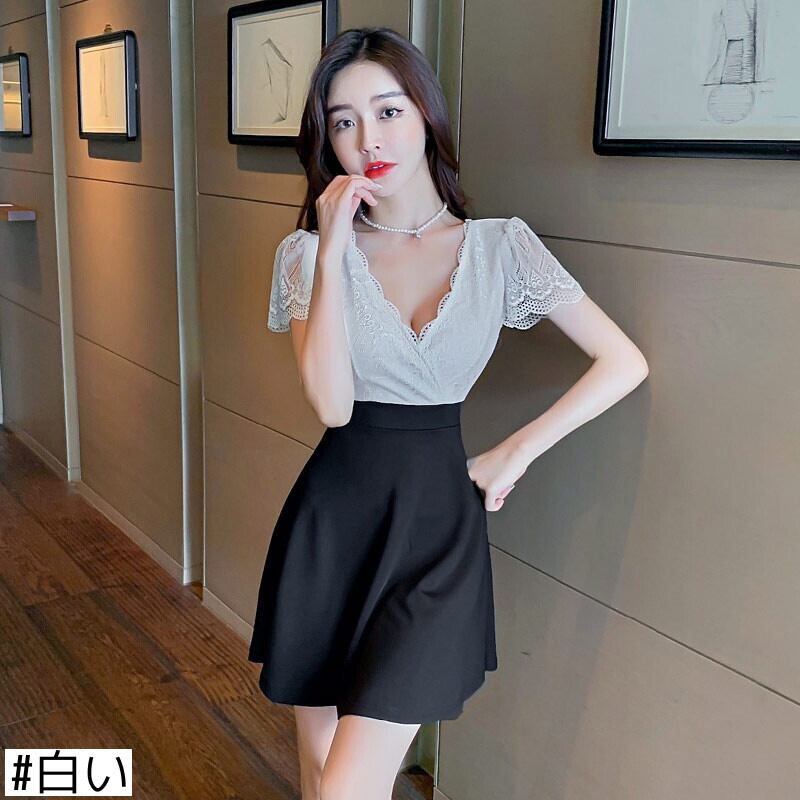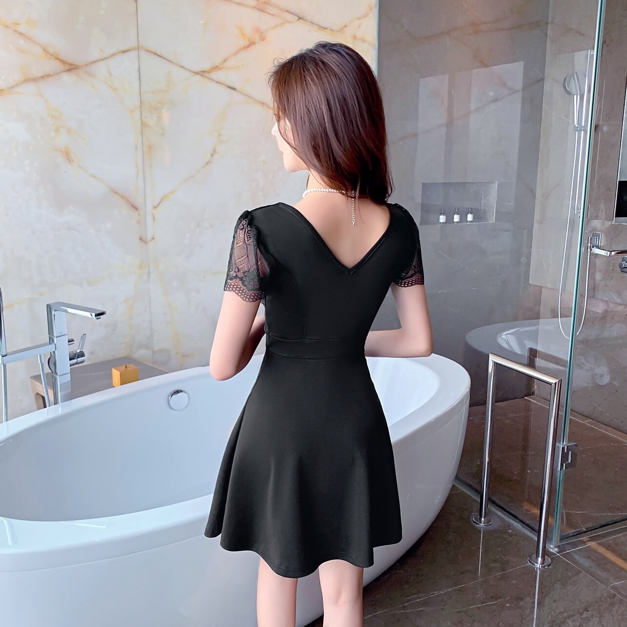 ナイトクラブの女性の気質セクシーなオーバーオールローカットディープVネックレースステッチウエストと薄い半袖ドレス micat55233135958