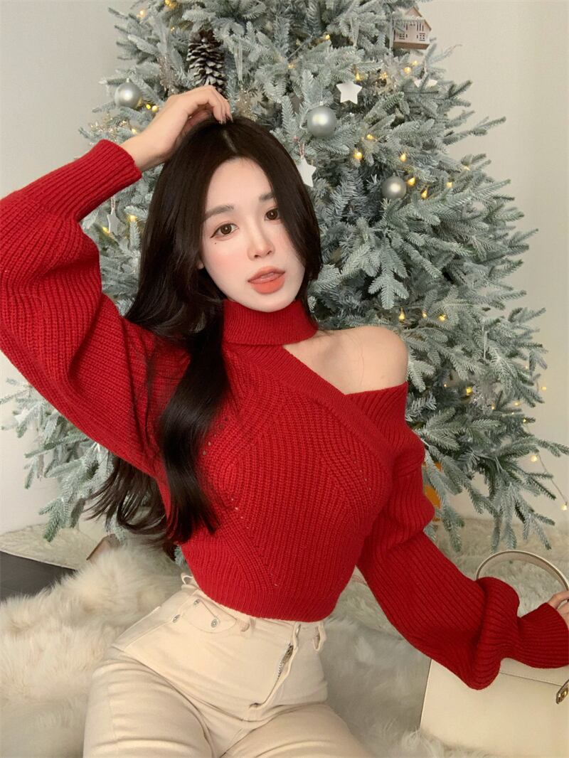 年服2022年生放送アンカー赤シャツセクシーな斜めの襟ワンショルダーオフショルダーショートホルターセーター micat320407799