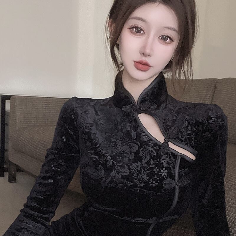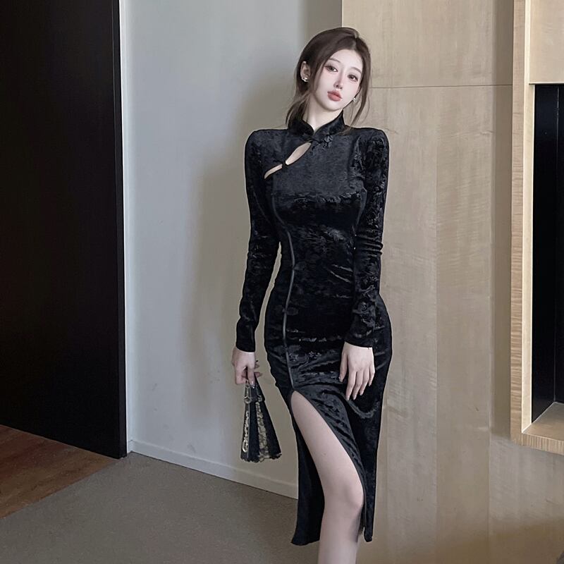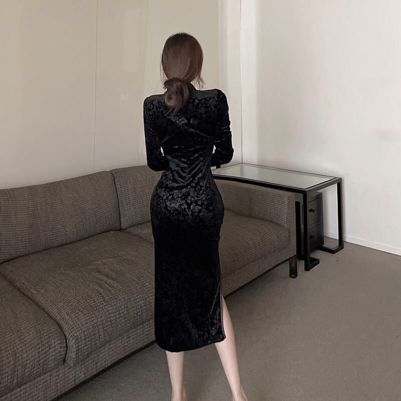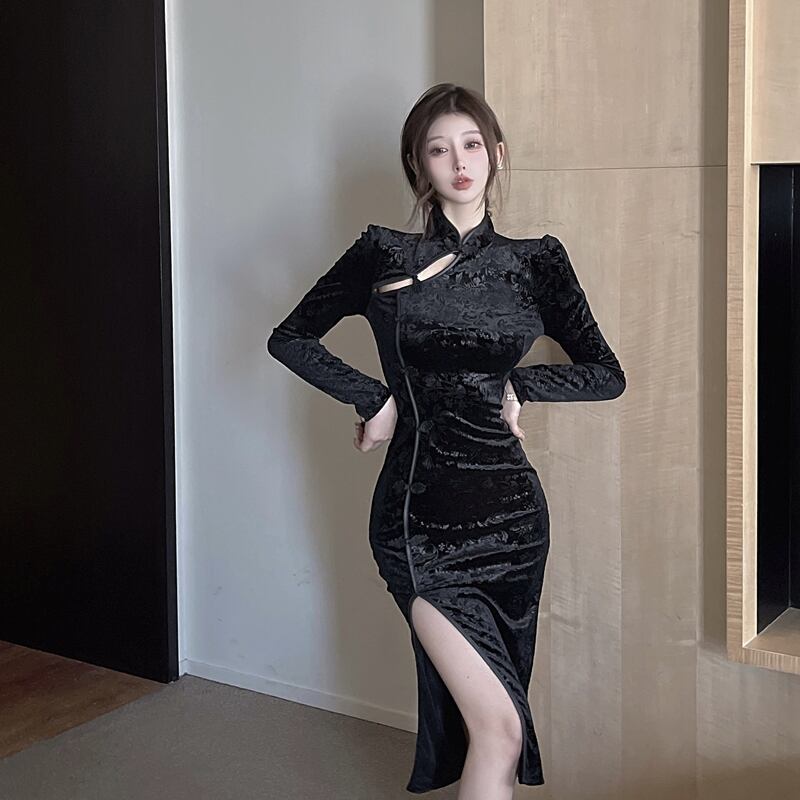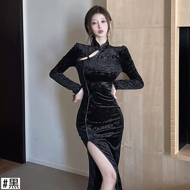 チャイナドレス2022新しい春の若いセクシーな中空ゴールドベルベットスリムスリットミドル丈ドレス micat29545204572