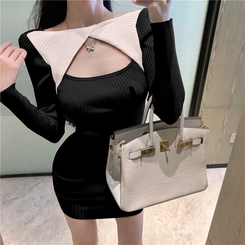 2022年春の新作婦人服デザインセンスニッチセクシーホローカラーマッチングニットボトミングドレス micat90161071481