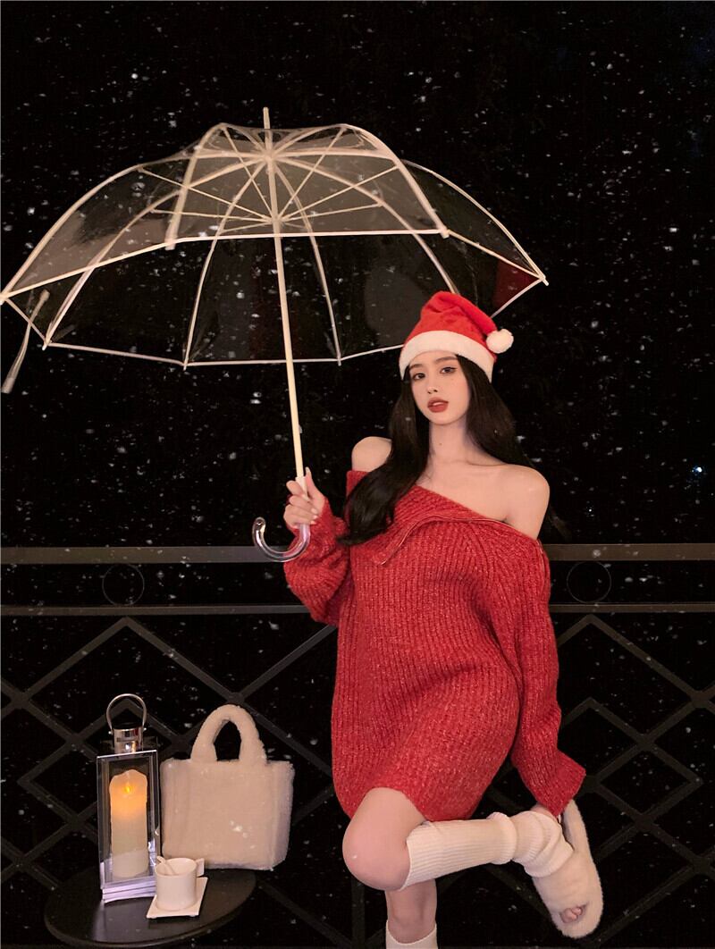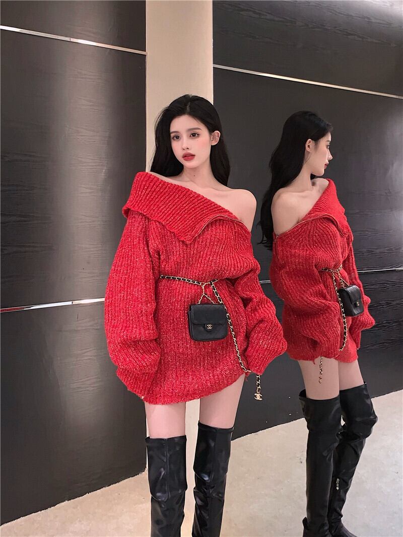 赤いセータードレス年着2022ライブストリーミング服アンカーセクシーなスラントカラーオフショルダードレス micat43972626346