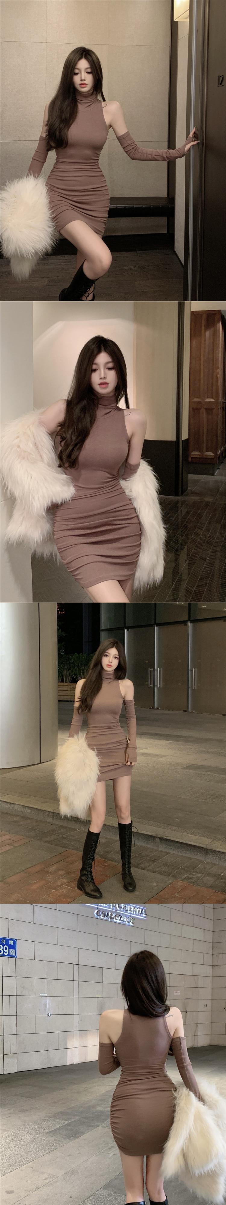 2022年春の新しい婦人服純粋な欲望セクシーなオフショルダーセミハイカラー無地インナーボトミングドレス micat26826090554