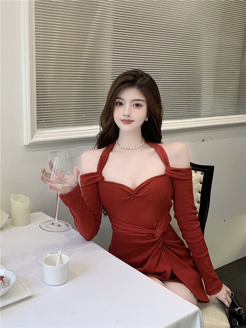 今年の赤い生放送服女性アンカーポジェニックハイエンドセクシーバッグヒップ長袖オフショルダーホルターネックドレス micat49788715630