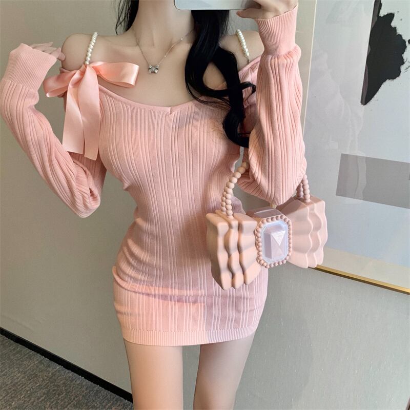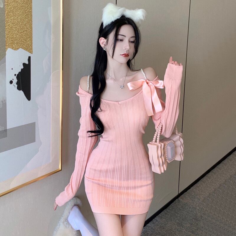 生放送服女性アンカーポジェニックハイエンド甘い弓純粋な欲望スタイルセクシーなオフショルダーニットサスペンダードレス micat21460985949