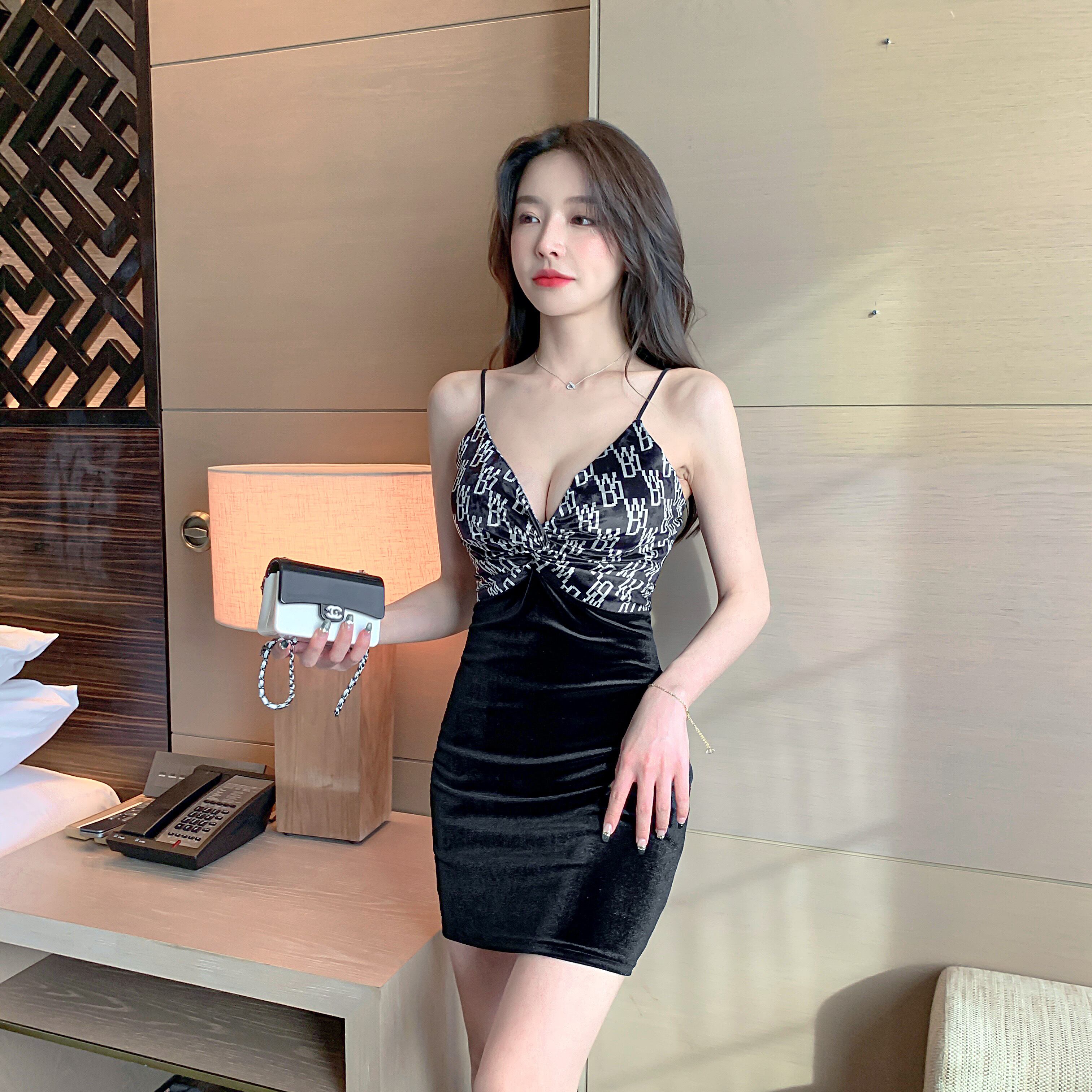 ナイトクラブの女性の作業服セクシーな作業服ローカットディープVネックヒョウ柄ステッチベルベットサスペンダードレス micat74928456354