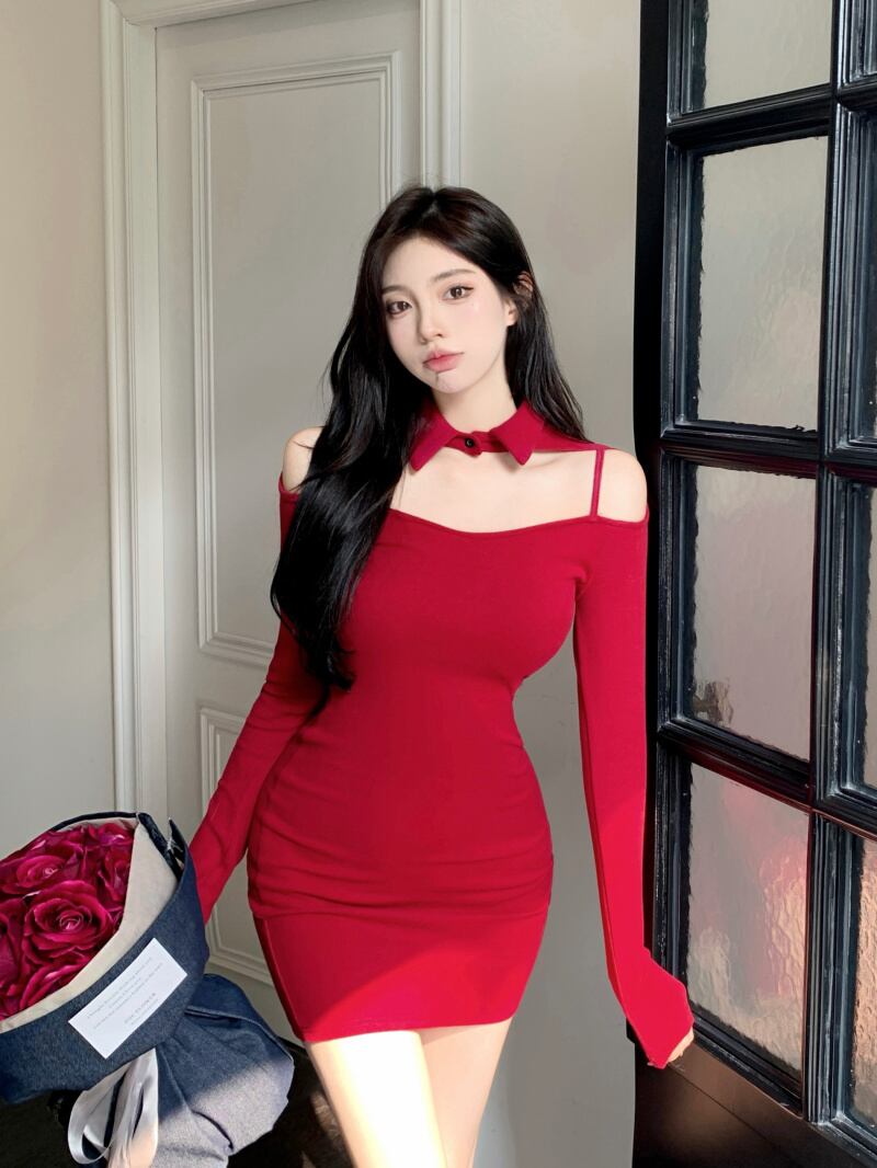 ライブ服女性アンカーポジェニックシニアイヤーズイヤーレッドセクシーオフショルダーハンギングネック長袖サスペンダードレス micat94895084422