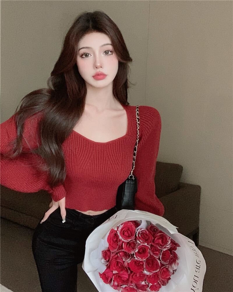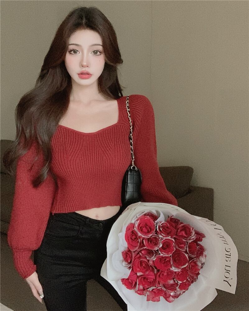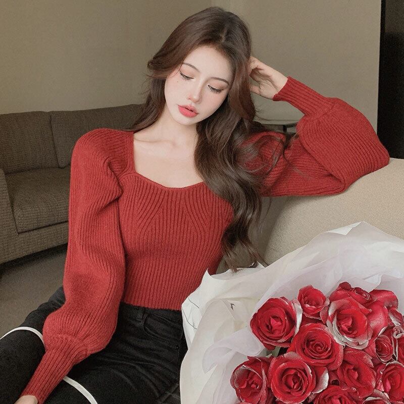 年服女性2022年生放送アンカー服赤出生年トップフレンチスクエアカラーパフスリーブセーター micat67770383197