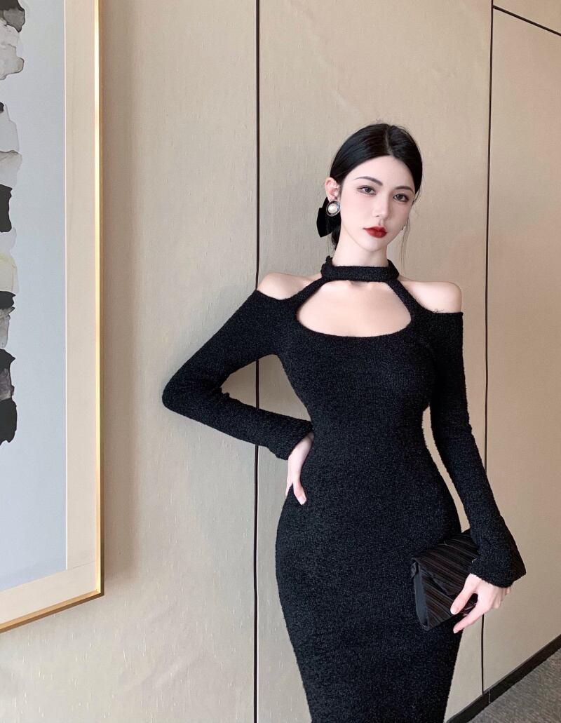 黒のイブニングドレス女性のロイヤルスタイルの気質セクシーな長袖オフショルダーニットスリムミドル丈ホルタードレス micat67799919794