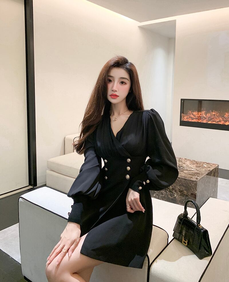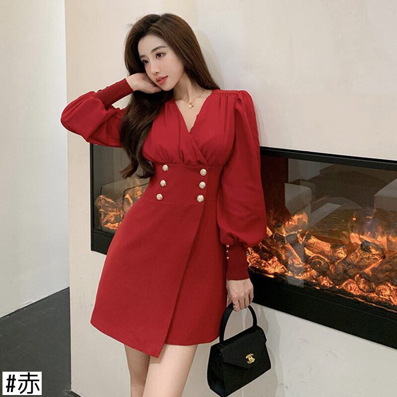 年服女性2022年赤出生年レトロフレンチパフスリーブ気質セクシーなVネックスーツドレス micat4337405517