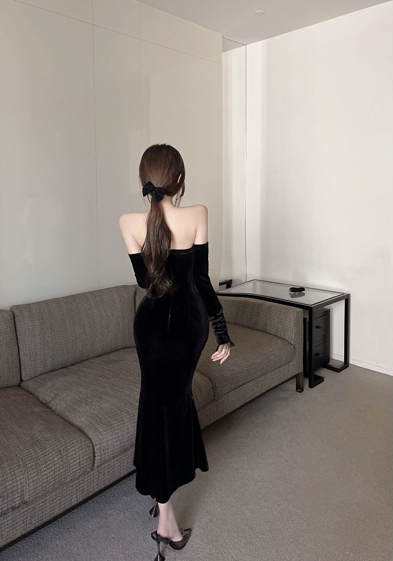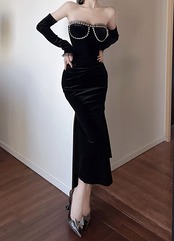 黒のイブニングドレスロングスカート女性の高級宴会気質セクシーな長袖ゴールドベルベットロングチューブトップドレス micat75032127124