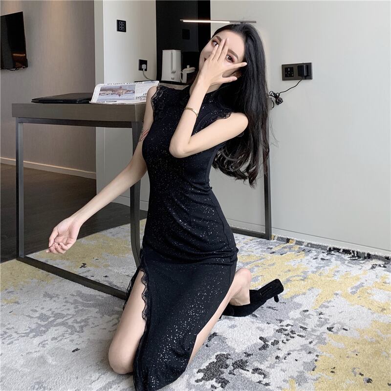 黒のイブニングドレスは、チャイナドレスの若いハイエンドの気質の光沢のあるセクシーなスリットミドル丈のドレスを改善しました micat84894826428