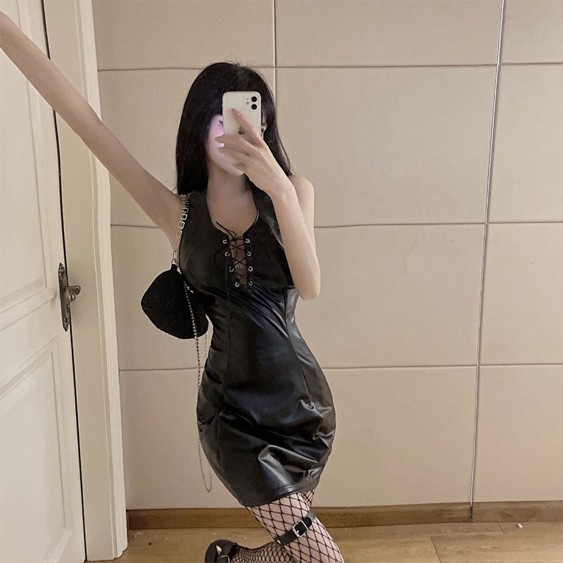 ナイトクラブレディースバーダンスPUレザーリトルブラックドレスショートセクシーローカットディープVネックストラップホルタードレス micat41123900060