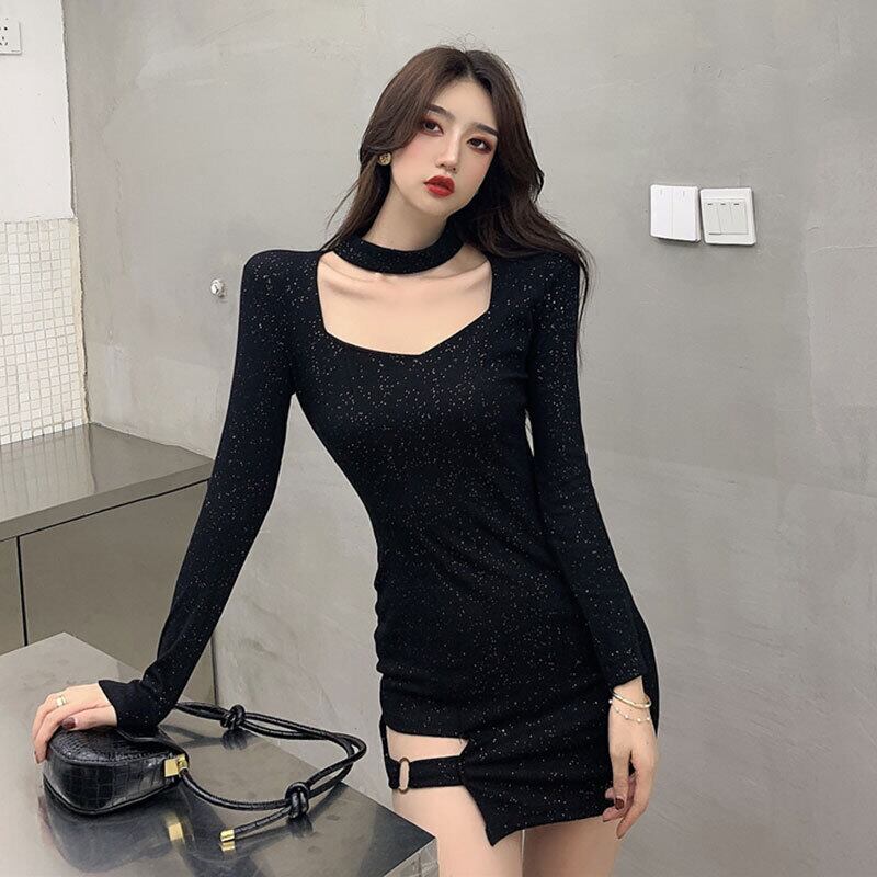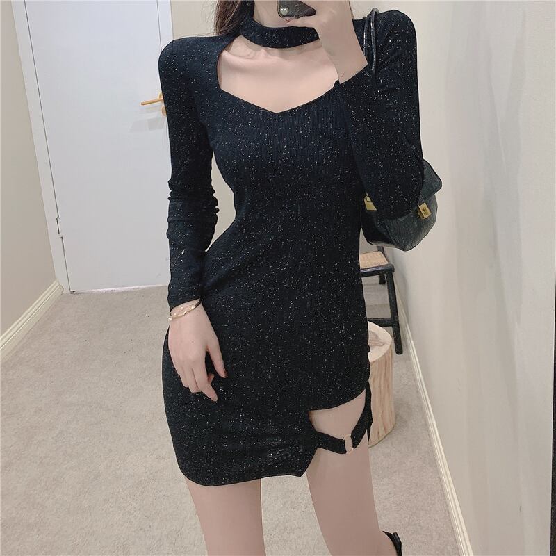 2021年秋新しい女性のナイトバーダンスディスクダンス光沢のあるセクシーな中空長袖スリットバッグヒップドレス micat66849264994
