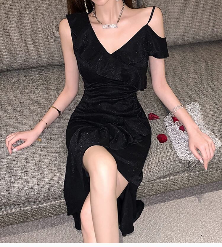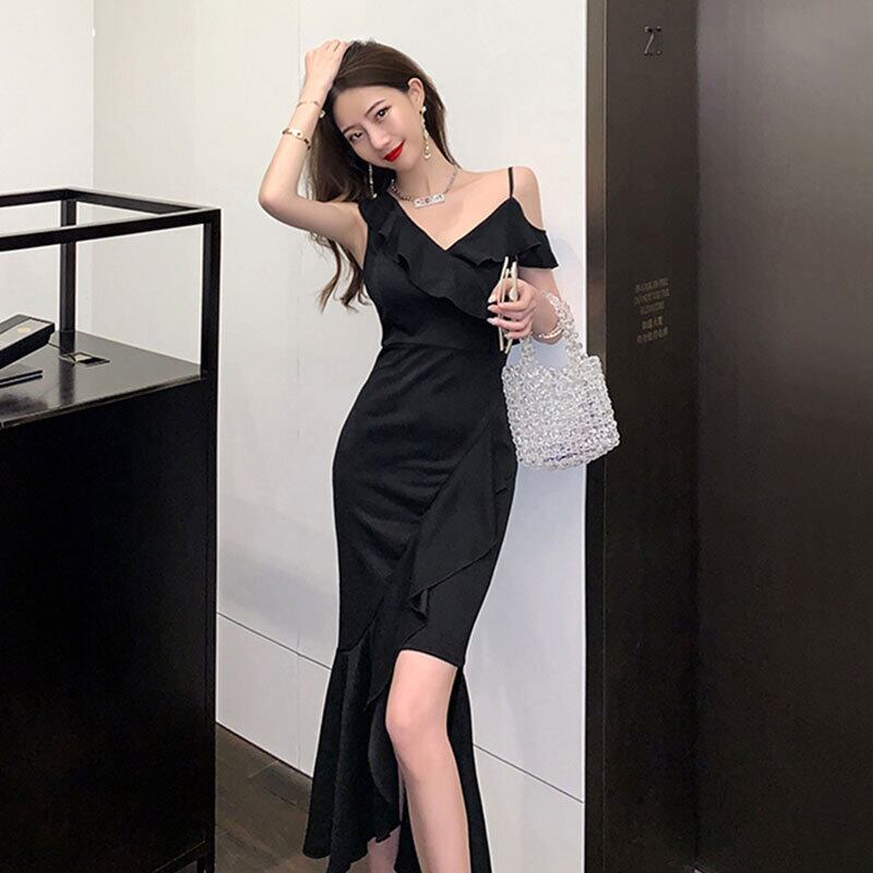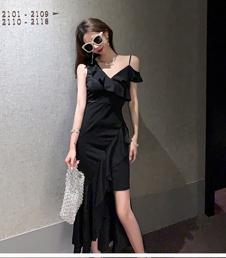 黒のイブニングドレスロングスカート女性2021年新しい宴会気質セクシーな不規則なフィッシュテールワンショルダーサスペンダードレス micat77962179220