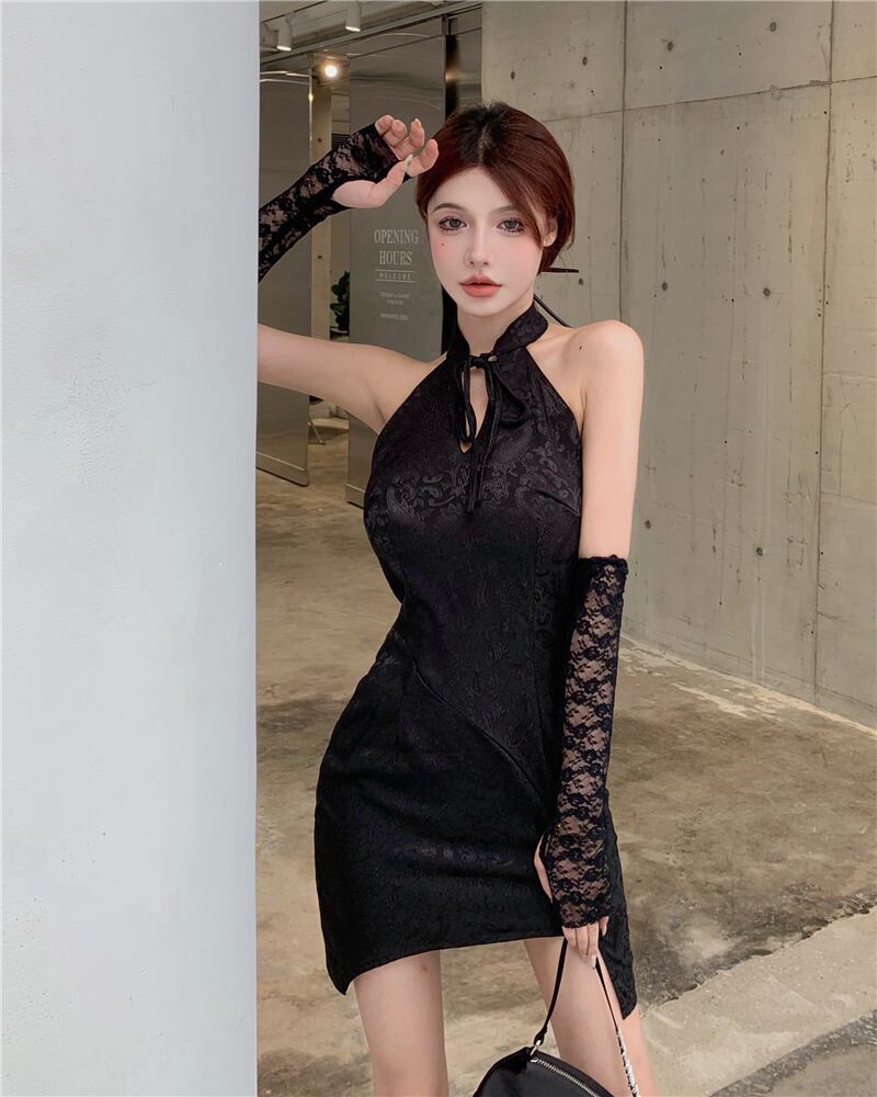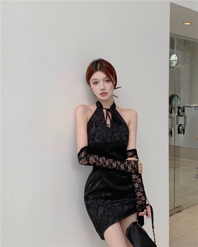 ナイトクラブの女性の夜の黒いイブニングドレスの宴会の気質セクシーなオフショルダーの吊り首はチャイナドレスを改善しました micat83783322016