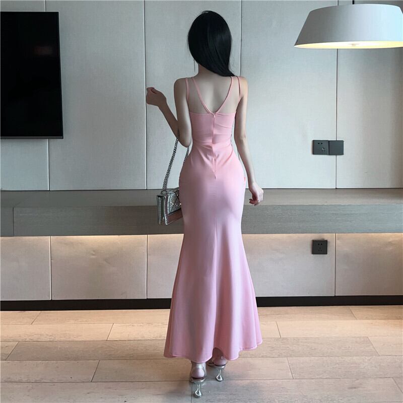 イブニングドレスロングドレスナイトショップレディース宴会気質セクシーローカットディープVネックメッシュステッチサスペンダードレス micat37608954428