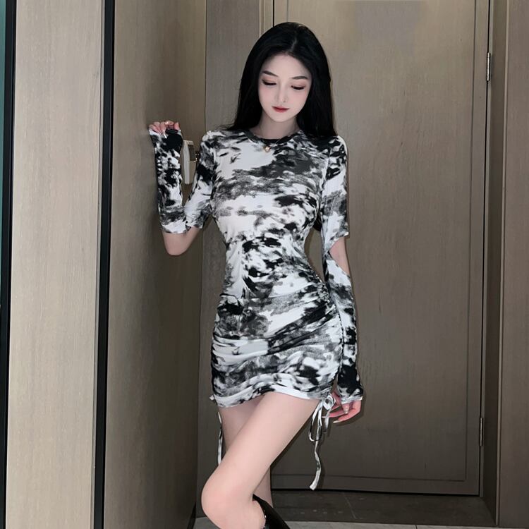 2021年新しい秋のセクシーなニッチインクファッション絞り染め巾着スリムフィットヒップラップヒップドレス micat21091827847