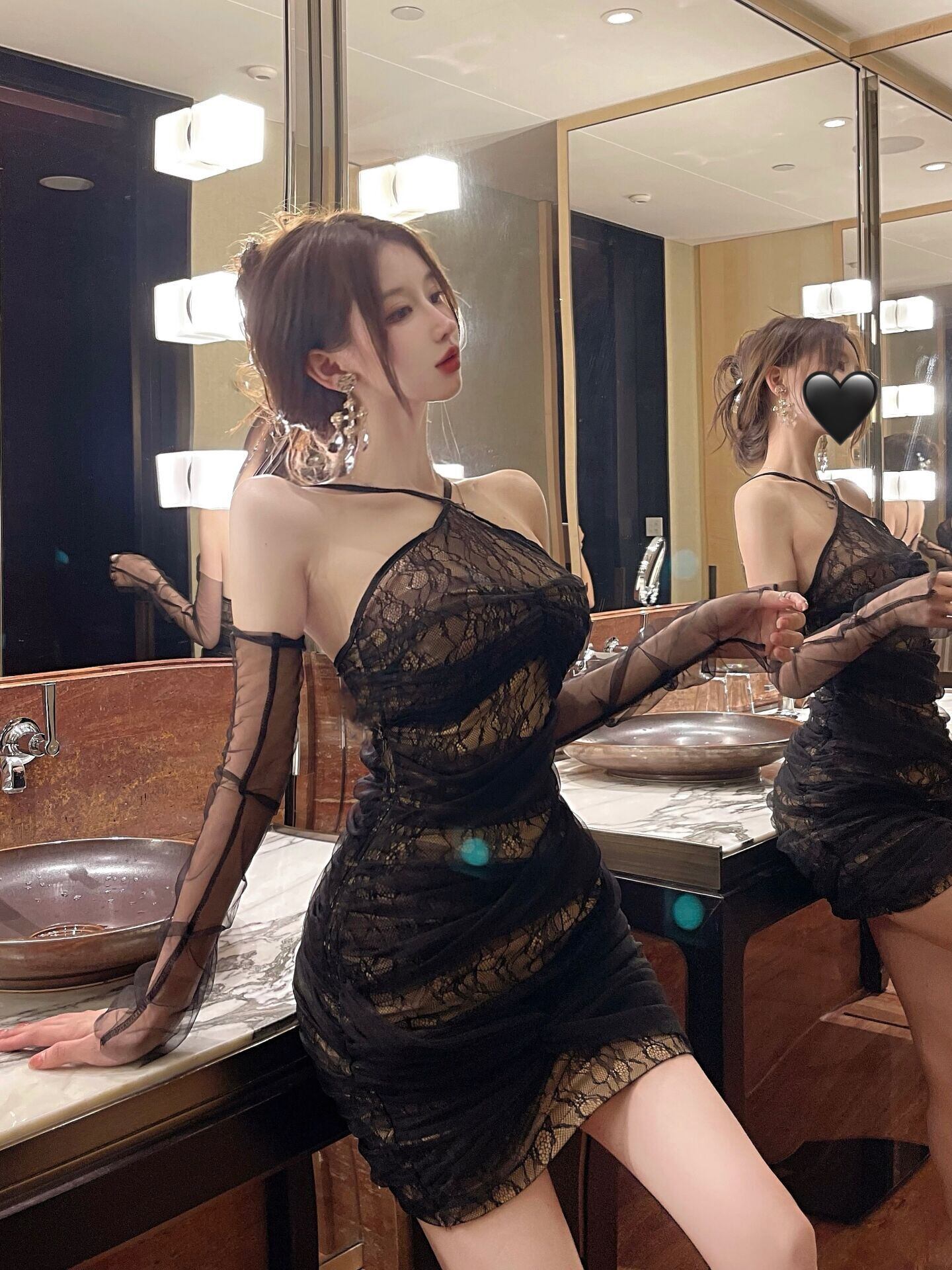 ナイトクラブの女性の秋と冬の年次総会小さなドレスショート気質セクシーなオフショルダーバッグヒップハンギングネックレースドレス micat86468424519