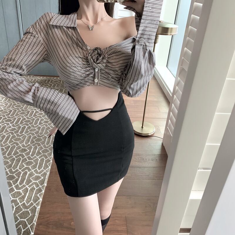 フライドストリートスウィートクールスーツスカートホットガールセクシーショートおへそストライプシャツ+ウエストスカートツーピースセット micat4938777117