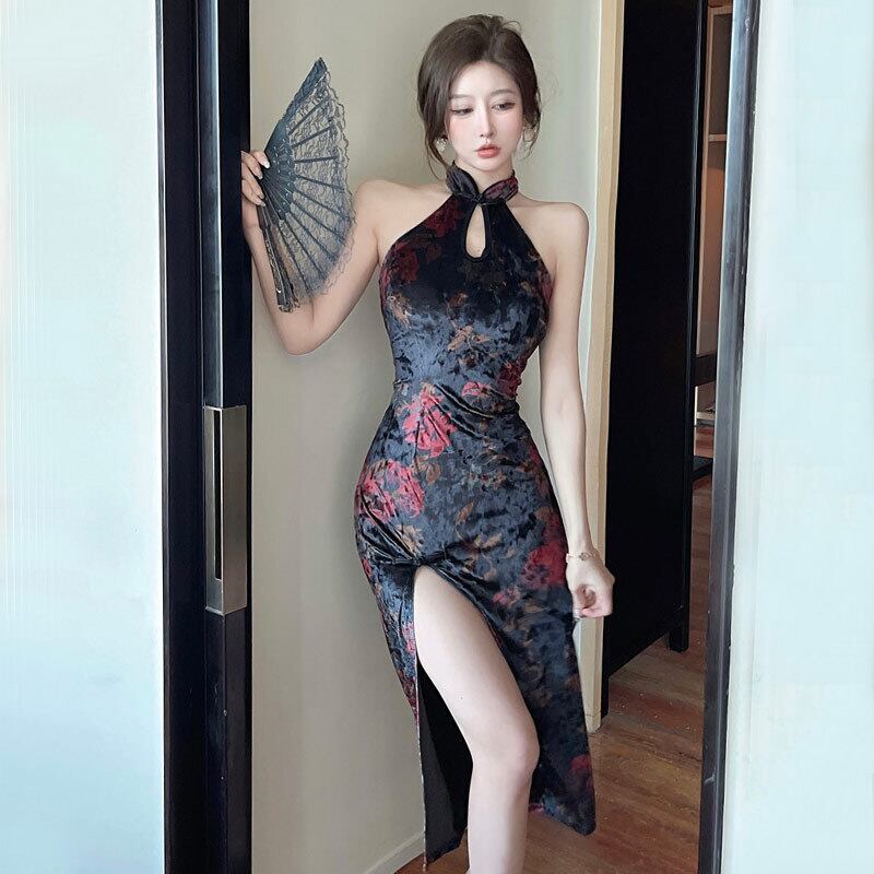 チャイナドレスイブニングドレスロングスカート女性ハイエンドチャイナスタイルレトロベルベットセクシーオフショルダースプリットロングホルタードレス micat83431788922