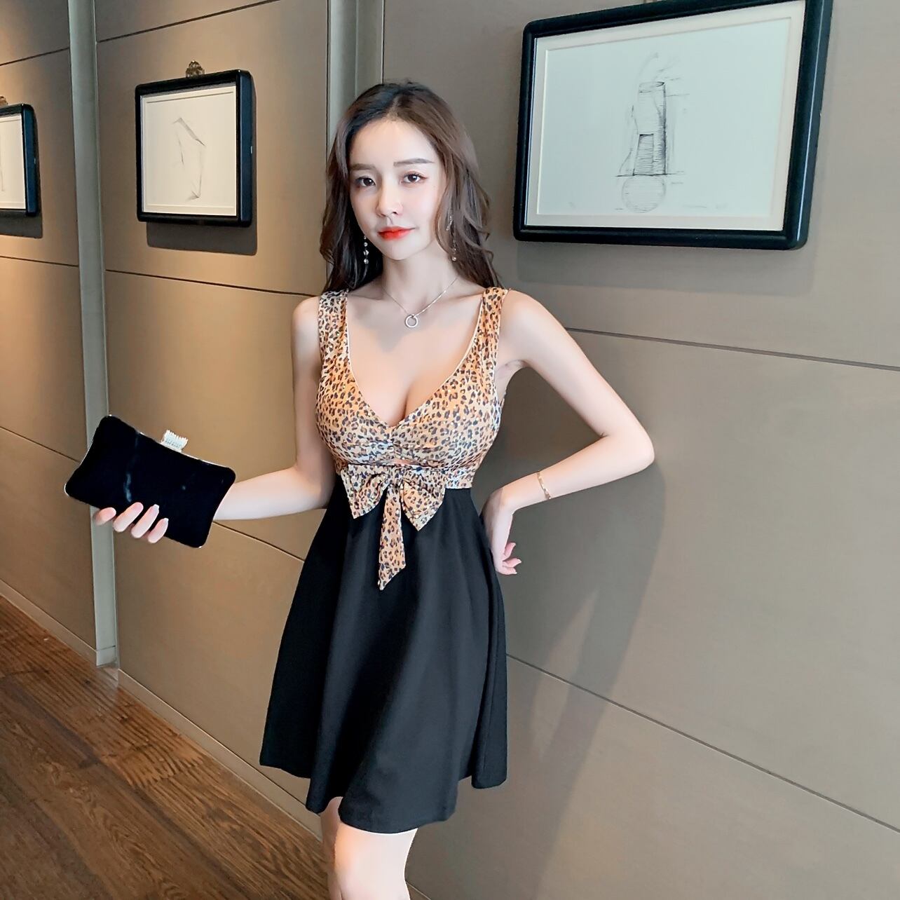 ナイトクラブの女性のセクシーなオーバーオール作業服ローカットディープVネックヒョウ柄ステッチ偽のツーピースノースリーブドレス micat31390935084