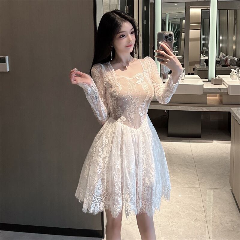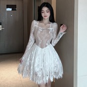誕生日の小さなドレスプリンセスドレス女性の大人の甘いスーパーフェアリーウエストは薄い長袖メッシュレースふくらんでいるドレスでした micat48011182488