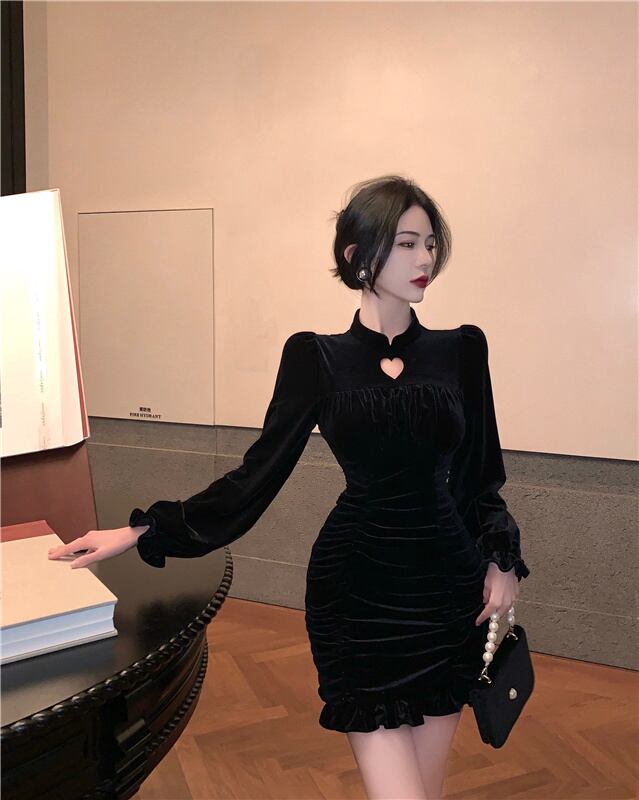チャイナドレス2021新しい秋と冬のハイエンドレトロな中国風のゴールドベルベットのセクシーなヒップドレス micat35992024234