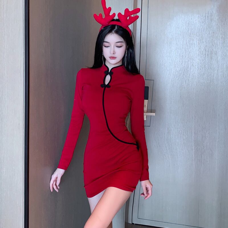赤いチャイナドレスのクリスマスのテーマの女性のアンカー服中国風のセクシーなショートヒップドレス micat68798656537