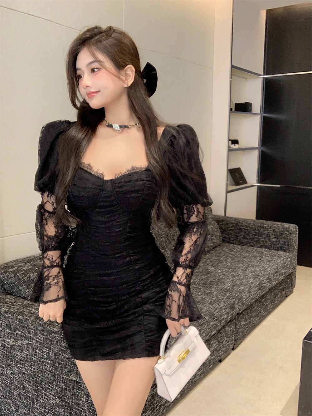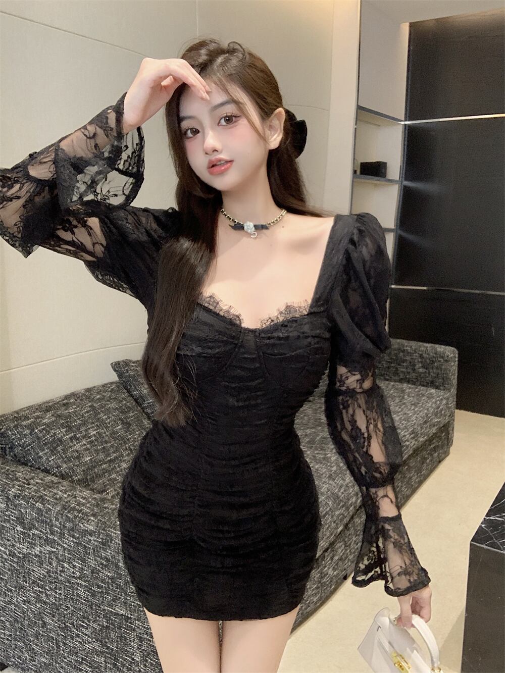 ライブ服女性アンカーポジェニックハイエンドフレンチドレス気質セクシースクエアネックパフスリーブレースドレス micat56628309591