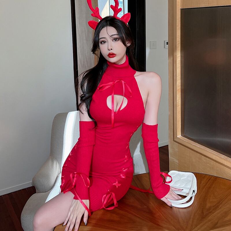 ネットレッドライブ服アンカーポジェニッククリスマステーマスカートセクシーな中空オフショルダーニットヒップドレス micat46685358690