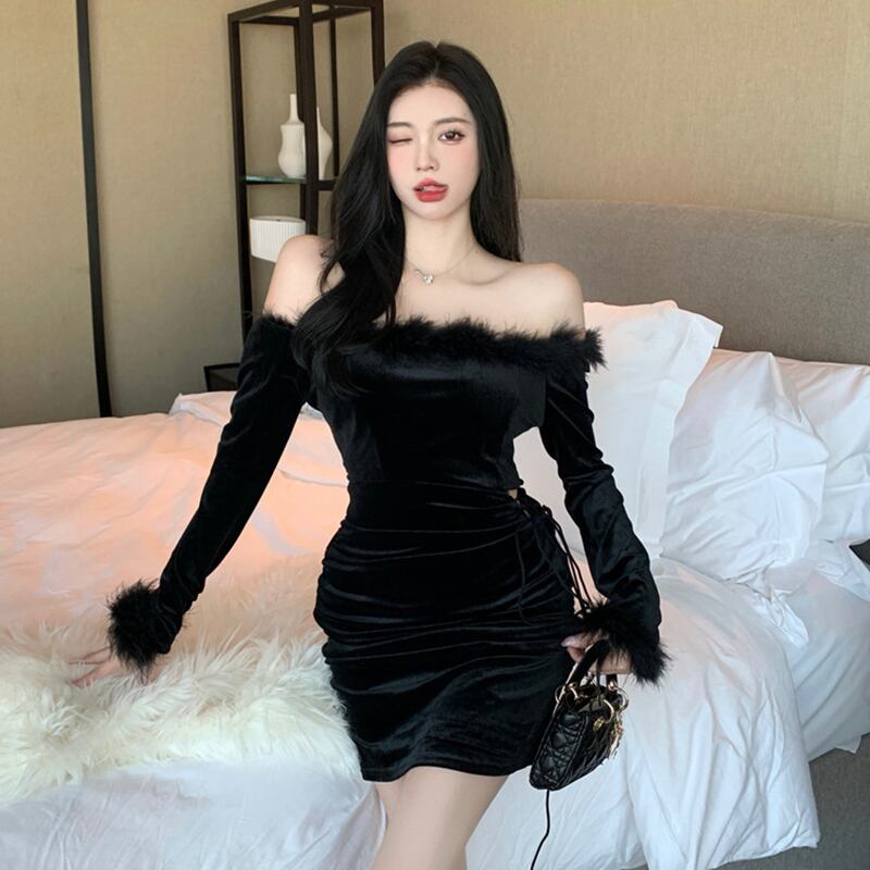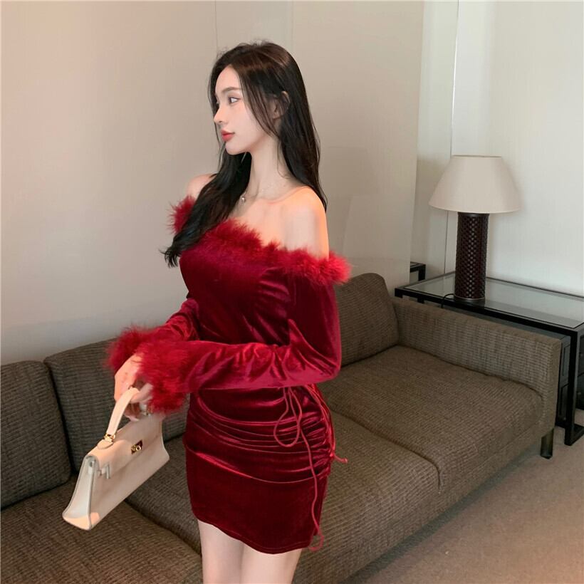 ナイトクラブの女性の秋と冬のクリスマスアンカーライブぬいぐるみセクシーなワンショルダーゴールドベルベット長袖ヒップドレス micat95113968053