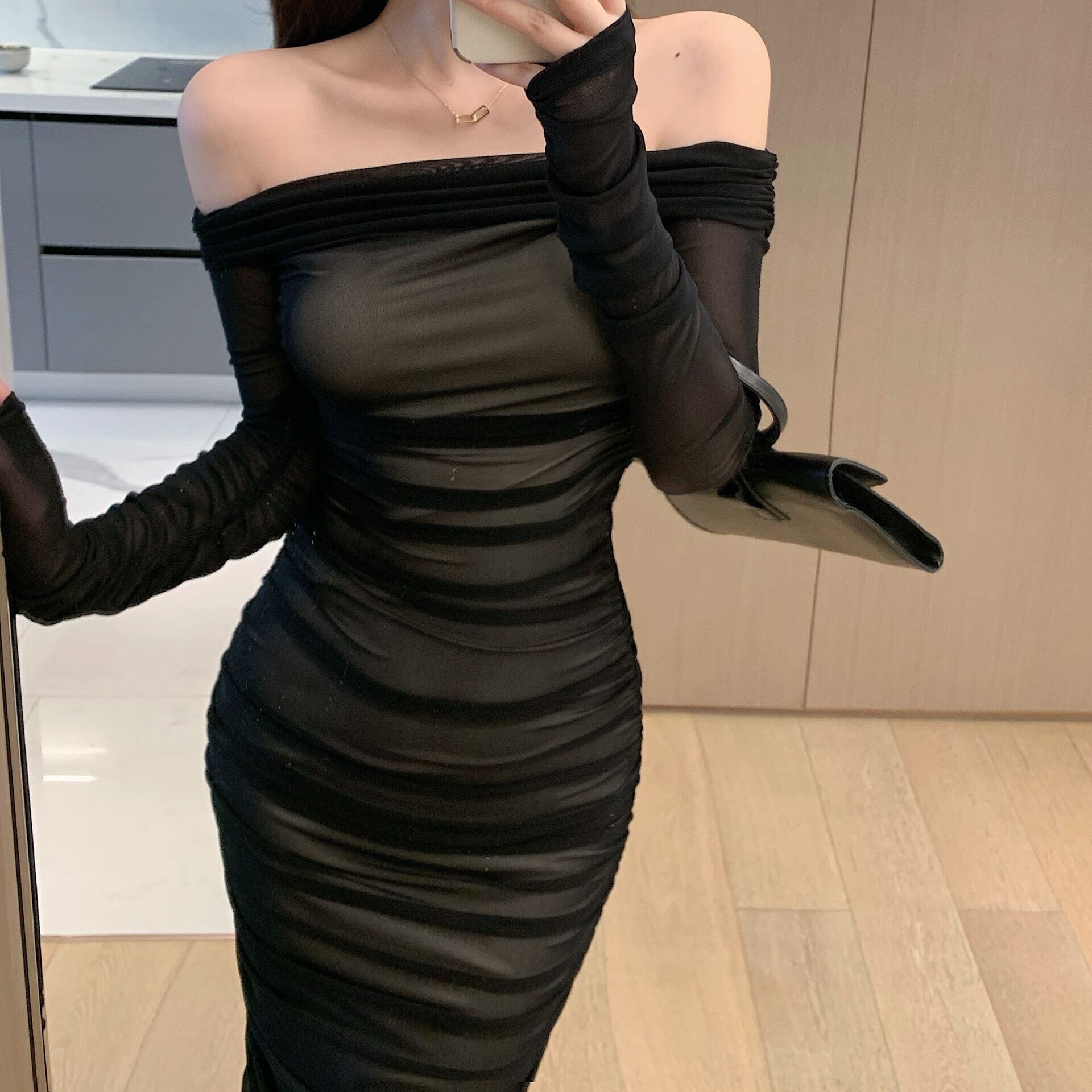 毎年恒例のパーティーイブニングドレス女性のナイトショップ宴会気質セクシーなワンショルダー長袖メッシュスリムミドル丈ドレス micat76768711280