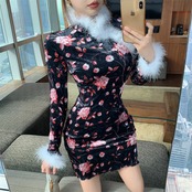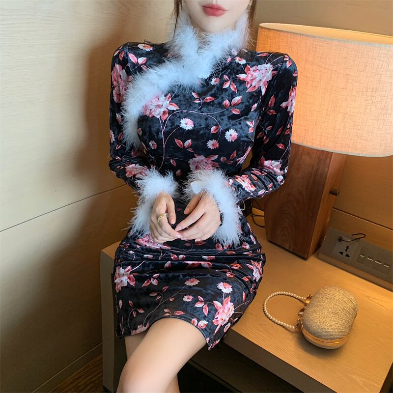 ライブ服女性アンカーポジェニック秋と冬の若いレトロな中国風のプリントゴールドベルベットチャイナドレス micat30108745893