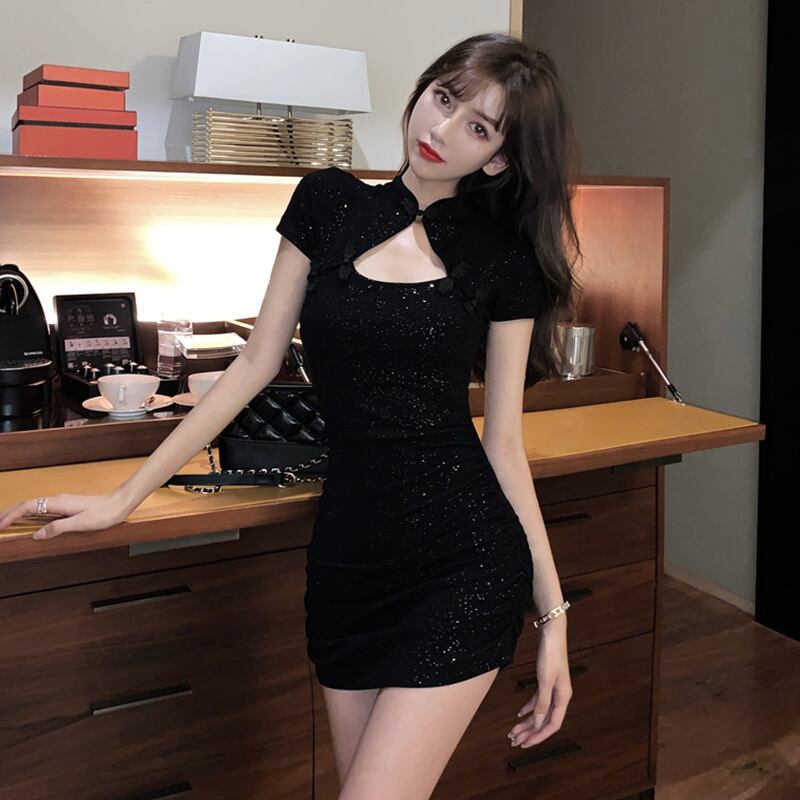 改良されたチャイナドレス2022新しい若い黒の光沢のあるシルクアンカーセクシーなショートドレス micat9147057080