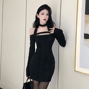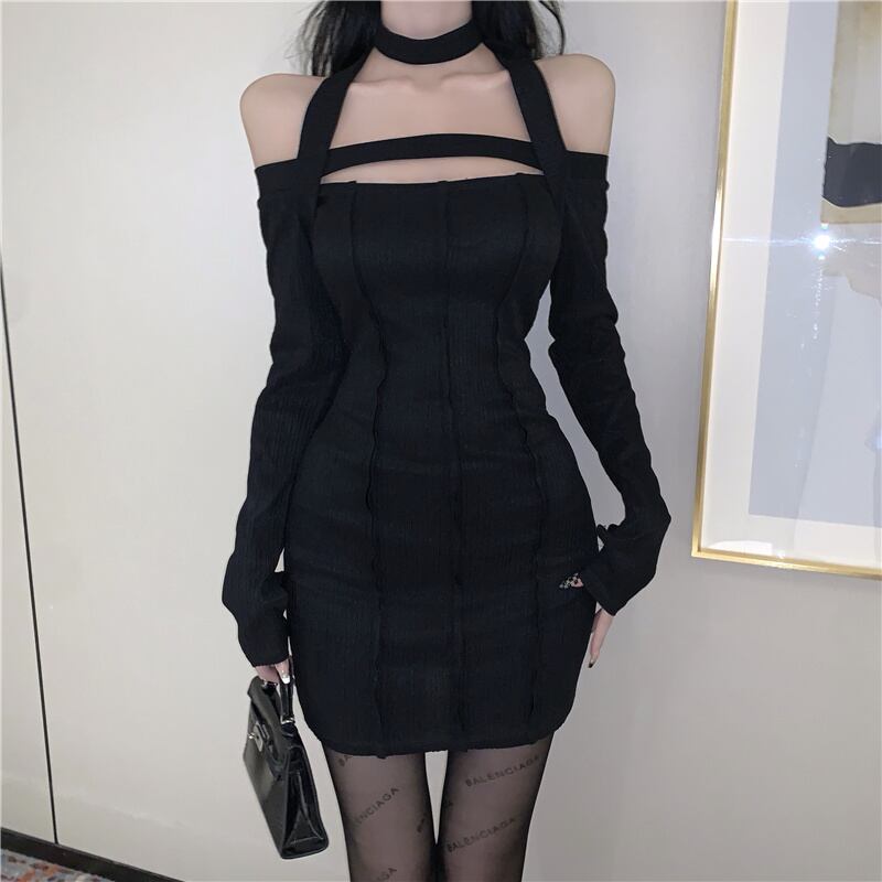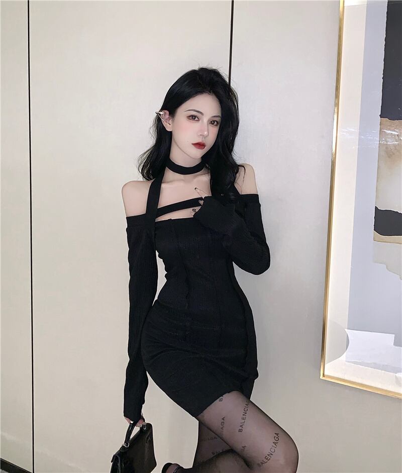 ネットレッドライブ服女性アンカーポジェニックハイエンドセクシーワンショルダーブラック長袖オフショルダーホルターネックドレス micat43753211377
