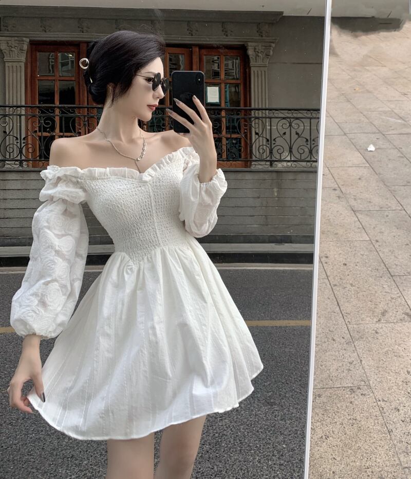 2021年秋新しい女性の白いスーパーフェアリーフレンチドレスセクシーなワンワードネックオフショルダーふくらんでいるドレス micat83005348100