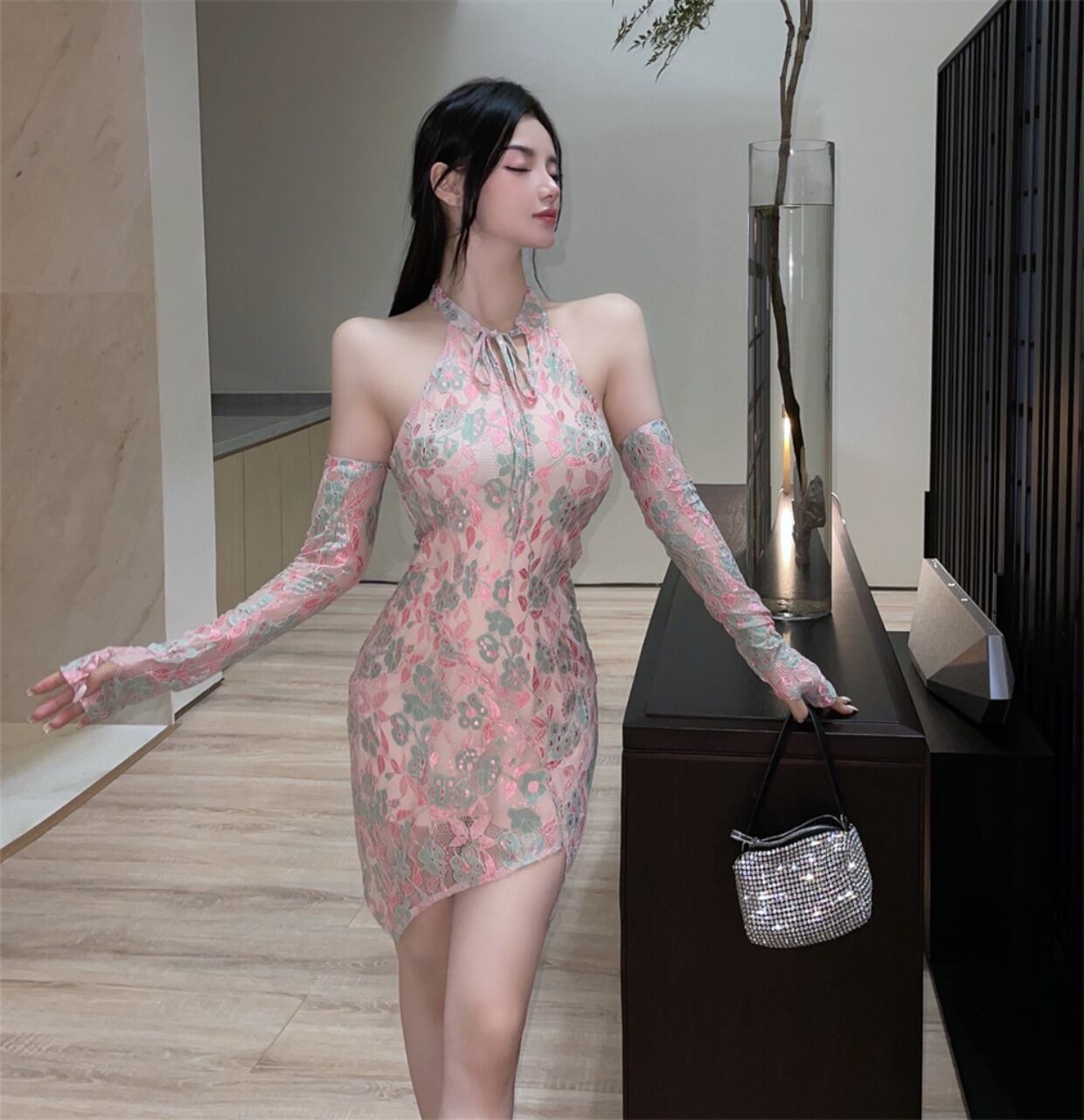 生放送服女性アンカー服ポジェニックシニア若いセクシーなオフショルダーハンギングネックレースチャイナドレス micat54964556875