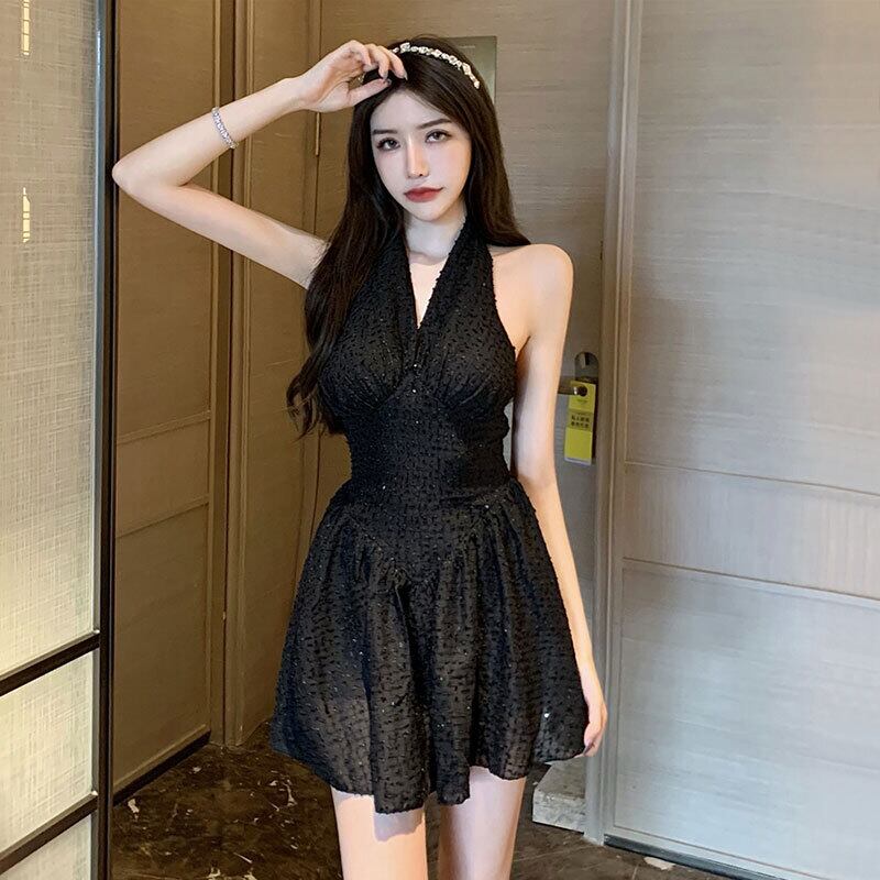 ディナーパーティー気質スモールドレスショートナイトクラブレディースセクシーVネックオープンバックふくらんでいるストラップホルタードレス micat93774636446
